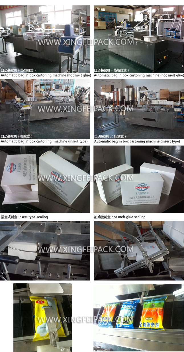 本機(jī)適用于袋裝產(chǎn)品的包裝,能自動(dòng)完成袋子輸送,紙盒供應(yīng),打開,袋子裝盒,封盒等工作。有兩種封盒形式可供選擇:插盒,熱熔膠。